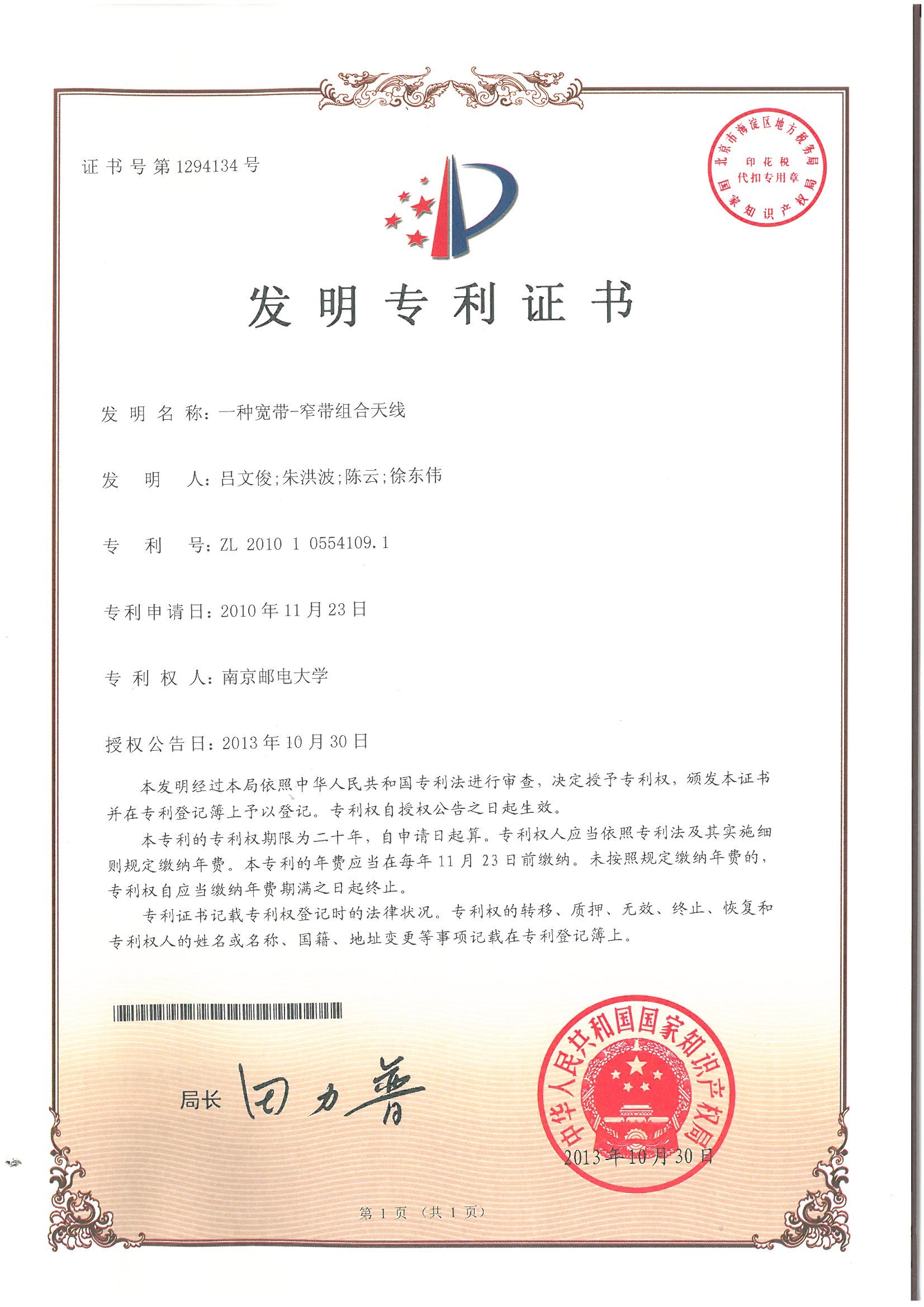 发明专利:一种宽带窄带组合天线